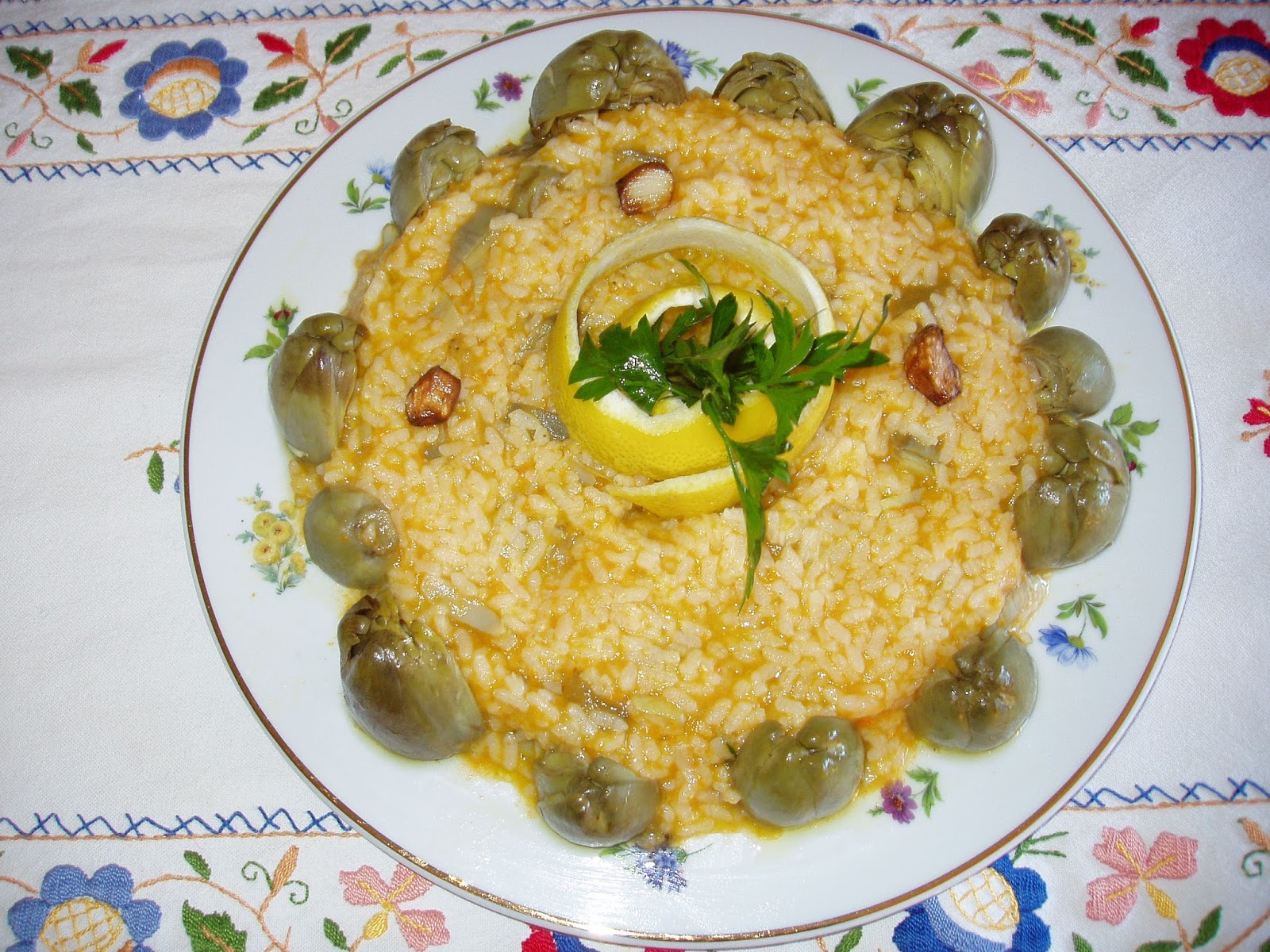 Se retira el arroz y se tiene preparado el corazón de la alcachofa y la berenjena, que se habrá cocido anteriormente, aparte, desechando el agua.