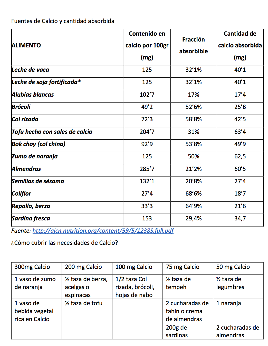 Los alimentos ricos en calcio son: algas, sésamo, frutos secos, los higos secos, las coles, los berros, las berenjenas, las espinacas, los puerros, los garbanzos, las lentejas, las sardinas (sobre todo enlatadas), la leche y derivados…