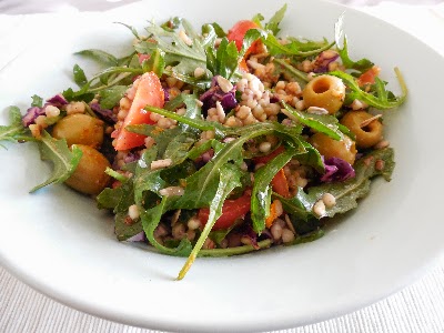 Se corta con la mandolina la col y la zanahoria. En una fuente ponemos la rúcola, los tomates troceados, la col y la zanahoria, las aceitunas, las nueces, las pipas y el trigo sarraceno. Removemos bien y añadimos la cúrcuma, la pimienta negra, las semillas molidas, el chorrito de limón y el aceite. Volvemos a remover con salero y listo para servir y compartir!!