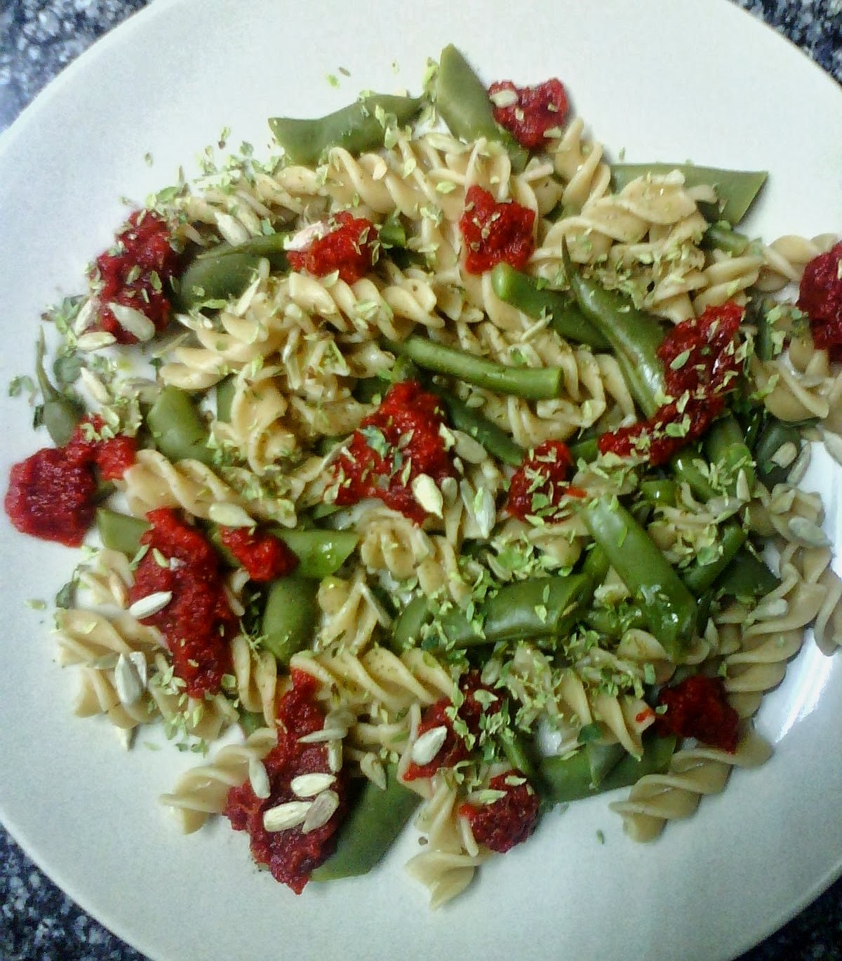 Aderezar la pasta con algunas cucharaditas de salsa y las pipas de girasol y espolvorear con orégano. Terminar con un chorrito de aceite de oliva en crudo y presentar.