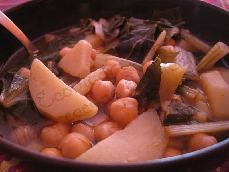 Se sofríen los dientes de ajo picaditos y cuando están dorados se añaden el pimentón y el comido. Se echan los garbanzos y se mueven para que cojan colorcito sin quemarse. Se pone agua (yo suelo calentarla en la hervidora eléctrica) y se deja cocer. Cuando los garbanzos están tiernos se añaden las patatas picadas y las acelgas, y se dejan cocer unos 15-20 minutos más.