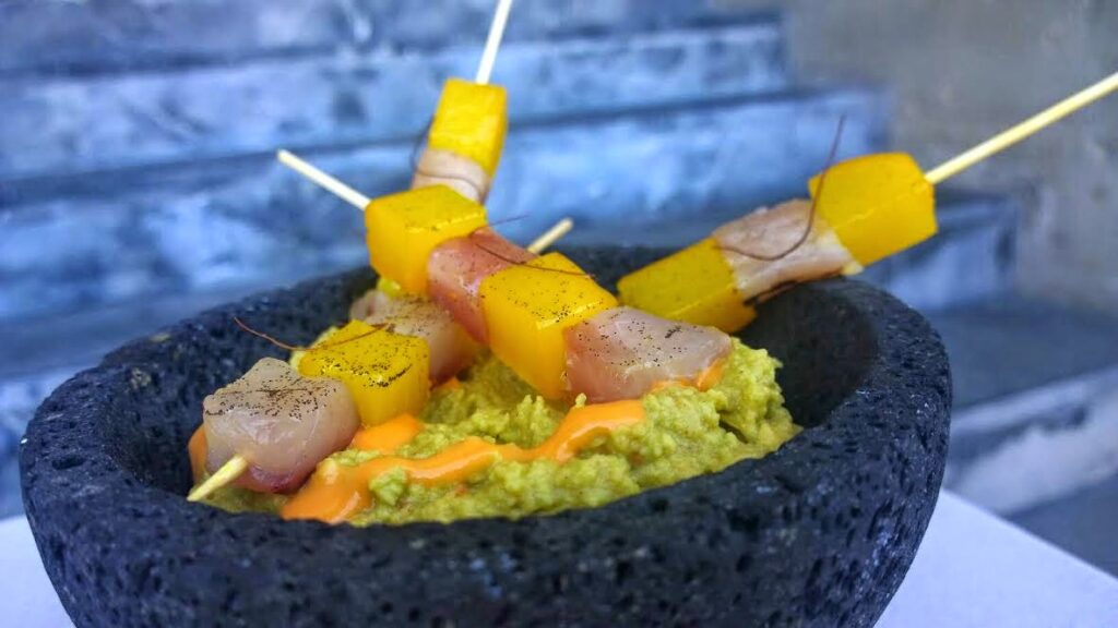 - Montamos la brocheta con todos los ingredientes elaborados como veis en la fotografía y untamos en la salsa de aguacate al gusto de cada comensal.