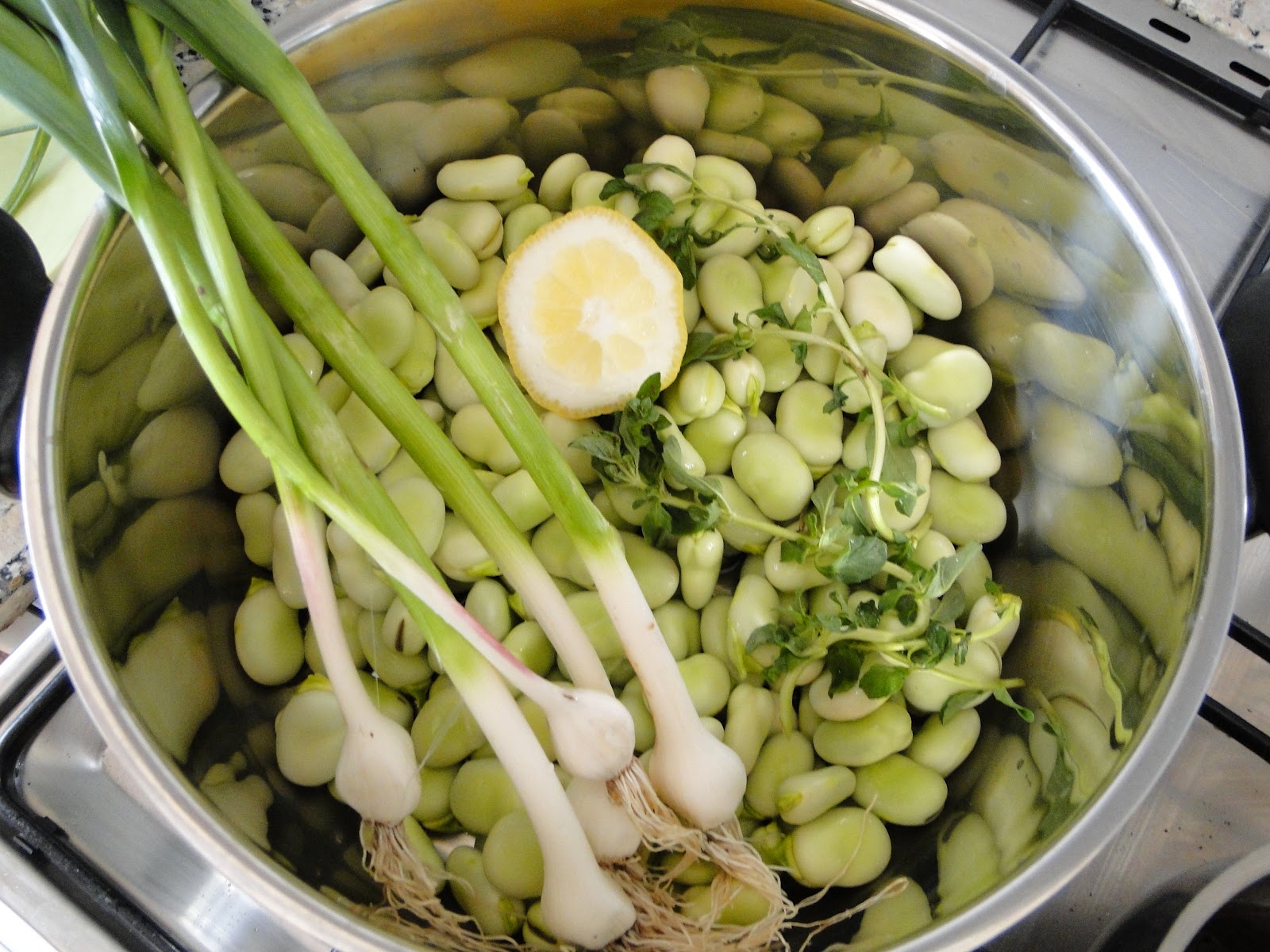 Una vez peladas las habas y enjuagadas, ponlas en una olla junto con los ajos frescos. Se cubre con agua y se le pone sal, el limón y el poleo bien lavado encima. Dejar hervir unos 10 o 12 minutos, según el gusto, deben quedar tiernos pero no romperse la cáscara.