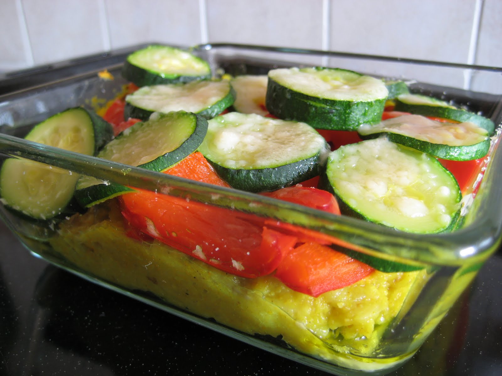 4. Montamos: Colocamos una capa de rodajas de calabacín, a continuación el paté de verduras, después el pimiento rojo y por último el calabacín