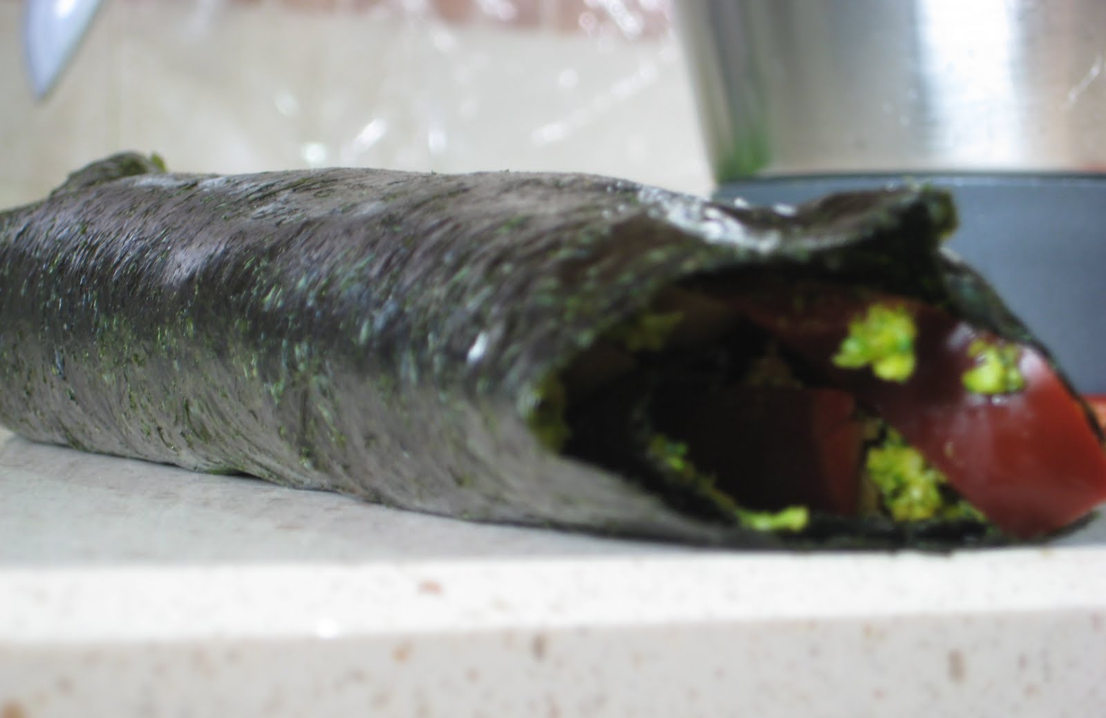 5. En el centro del alga colocamos el relleno y empezamos a enrollar en dirección al extremo libre de «arroz», al enrollar presionamos con suavidad para que se extiendan de manera uniforme todos los ingredientes.