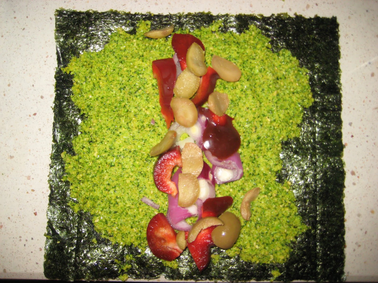 3. Colocamos el alga nori sobre una superficie lisa, y extendemos el «arroz», dejando un extremo libre para poder cerrar al final el maki.