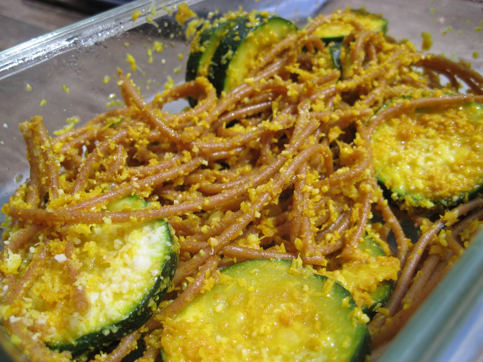 6. Colamos la pasta y la colamos en un bol, vertemos el calabacín y espolvoreamos con semillas de lino.