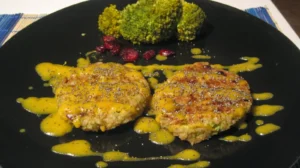 Hamburguesas de avena con brócoli y bechamel de cúrcuma