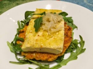 Montadito de tofu y verduras con salsa de AOVE y miel
