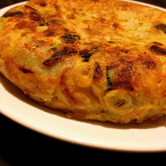 En un bol mezcla con una varilla manual unos 35 gr de harina de garbanzo con agua. Ha de quedar la textura como de un huevo batido. Mezcla bien con las patatas, la cebolla y el calabacón y prepara la tortilla de manera tradicional.
